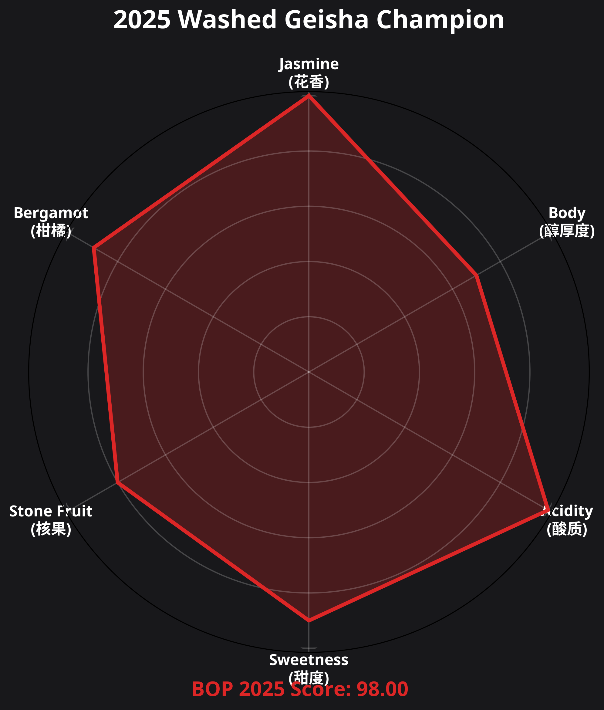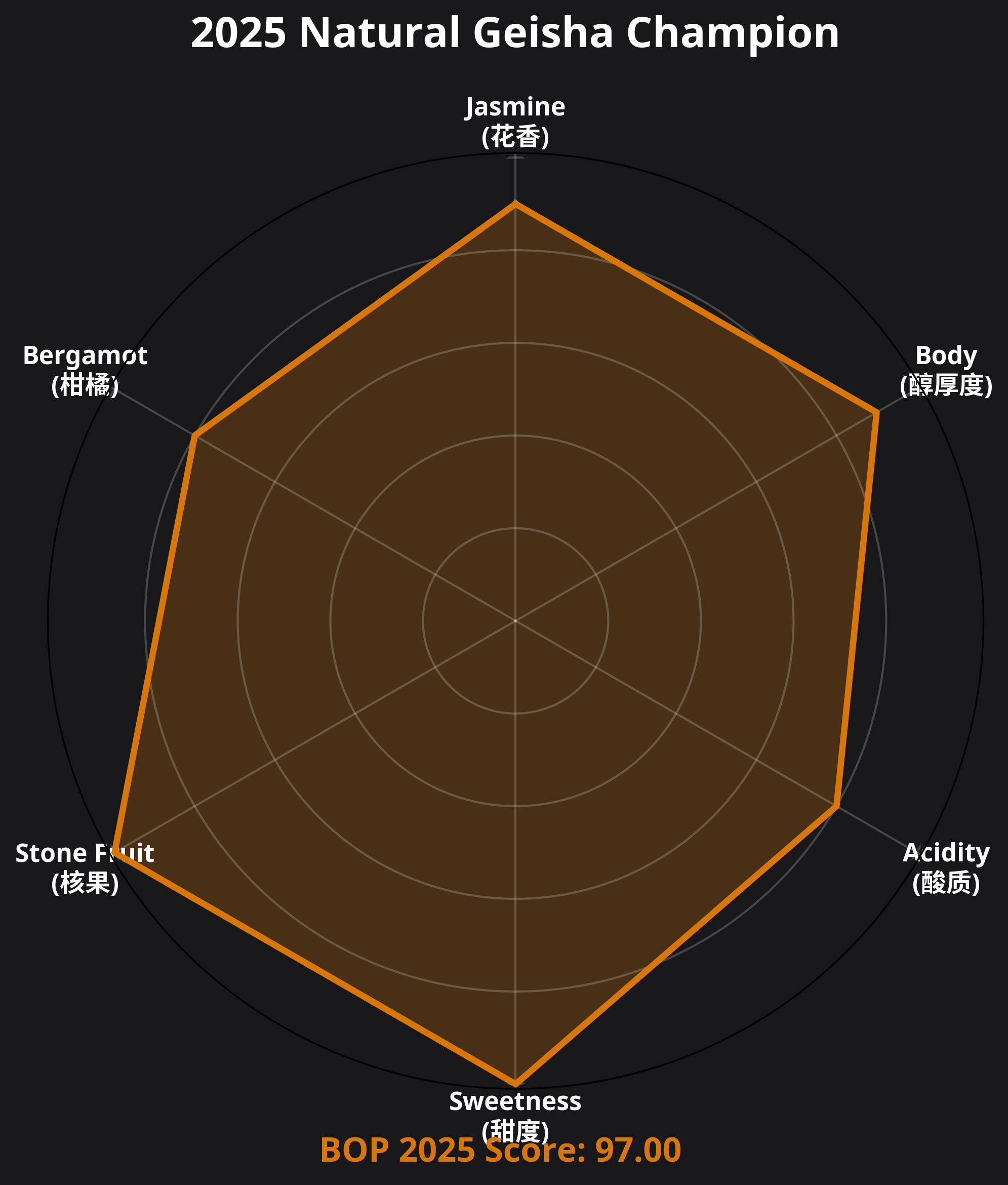 2025年,翡翠庄园以不可思议的统治力,包揽 BOP 水洗与日晒双料冠军,并刷新了人类咖啡竞标史上的最高分纪录。